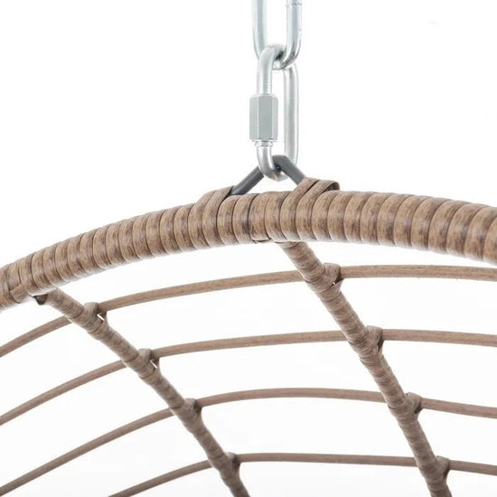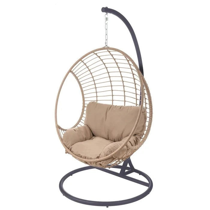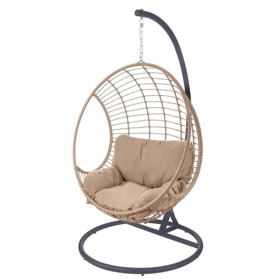 Esta cadeira suspensa de estrutura em aço com acabamento em epóxi preto, entrelaçado em vime sintético e almofadas na cor Taupe.