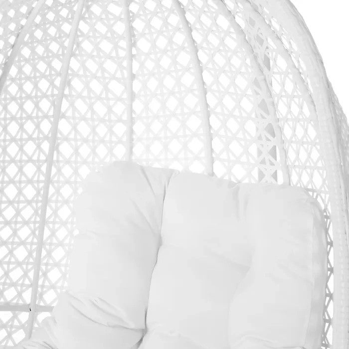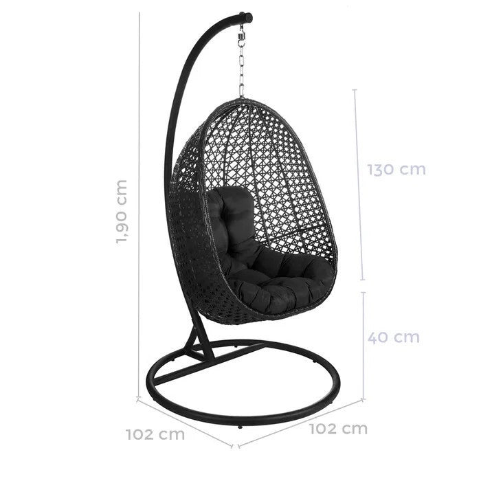 Esta cadeira suspensa de estrutura em aço com acabamento em epóxi, entrelaçado em vime sintético e almofadas que possuem uma espessura de 16 cm e as suas capas são removíveis.