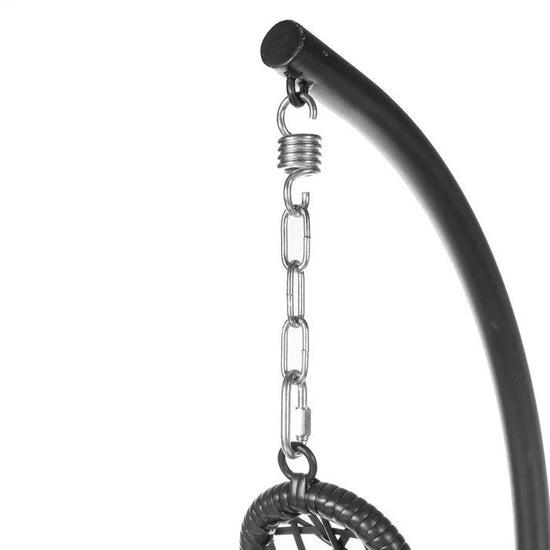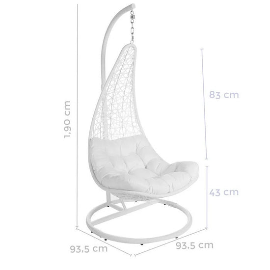 Esta cadeira suspensa de estrutura em aço com acabamento em epóxi, entrelaçado em vime sintético e almofadas que possuem uma espessura de 16 cm e as suas capas são removíveis.