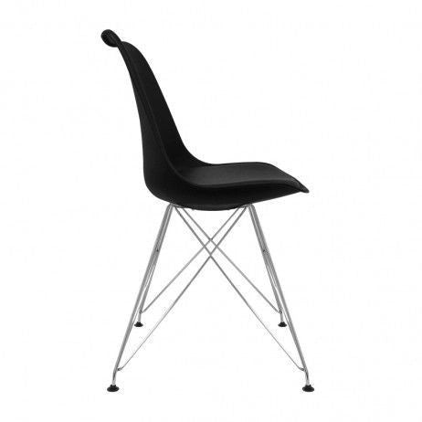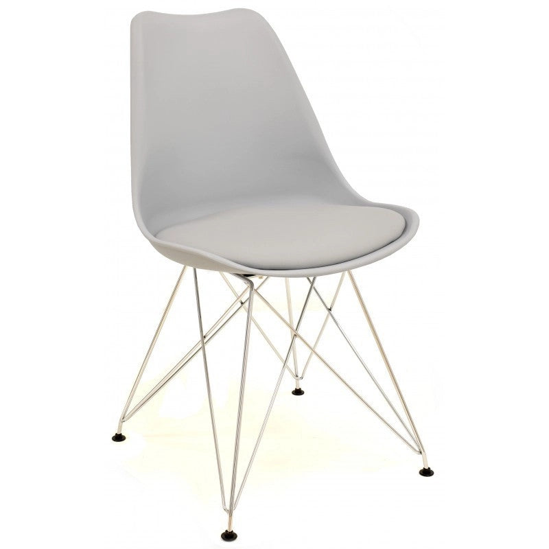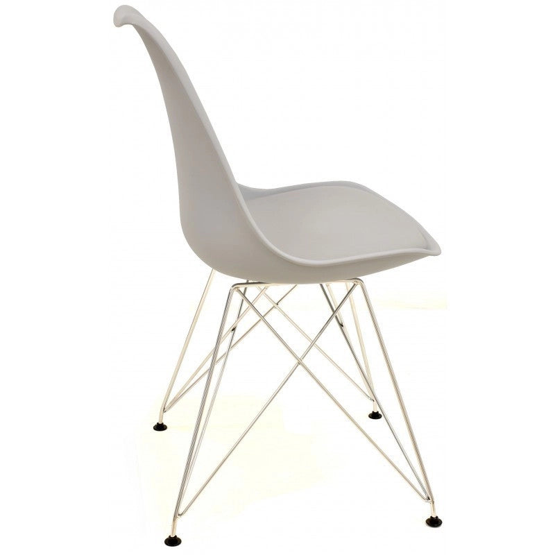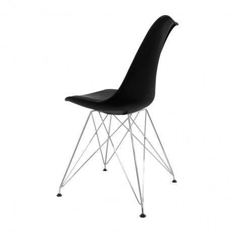 O assento e o encosto são constituídos por uma peça de polipropileno, com curvas sugestivas e acolchoamento, o que gera um efeito moderno e atraente. Por seu turno, as pernas da cadeira são hastes de aço cromado que se entrelaçam a partir do centro do assento. Este desenho traz uma sensação de lividez, que torna a peça ideal para um espaço diáfora não o sobrecarregando.