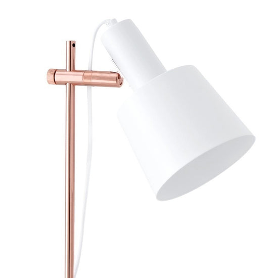 O Candeeiro de mesa Estel de design moderno e atualizado, com uma base metálica com acabamento em branco e um braço metálico com acabamento em cobre que suporta um abajur metálicos com acabamento em branco.