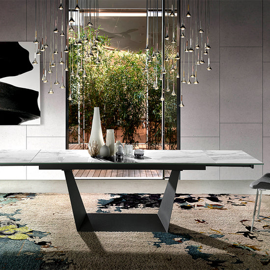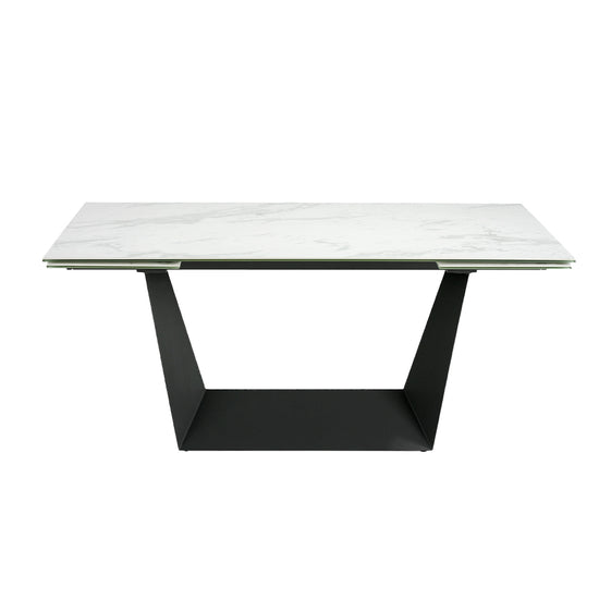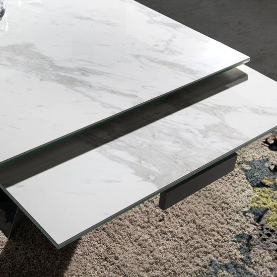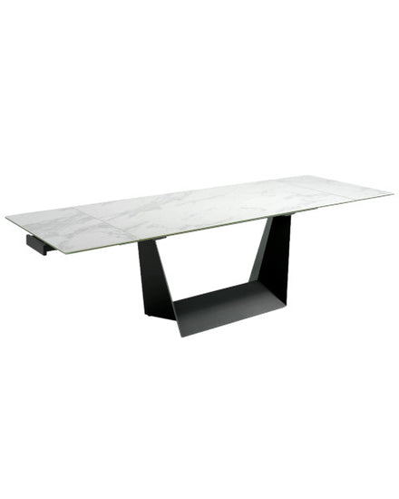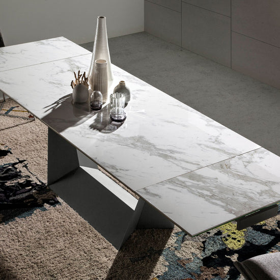 Mesa de jantar extensível retangular de design moderno com tampo em mármore porcelanato branco com veios cinzentos em acabamento brilhante.