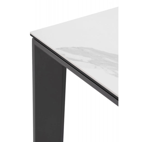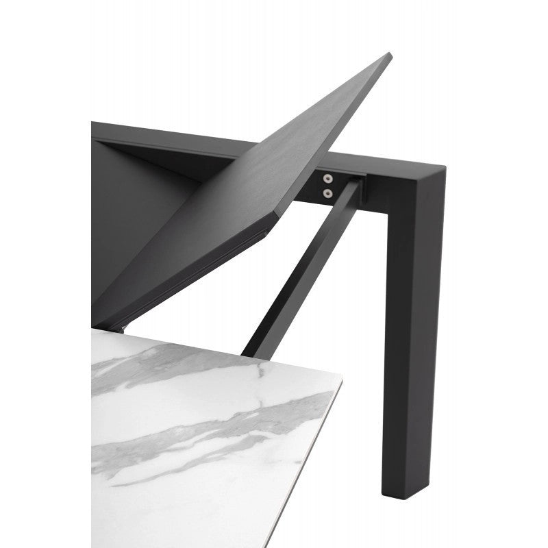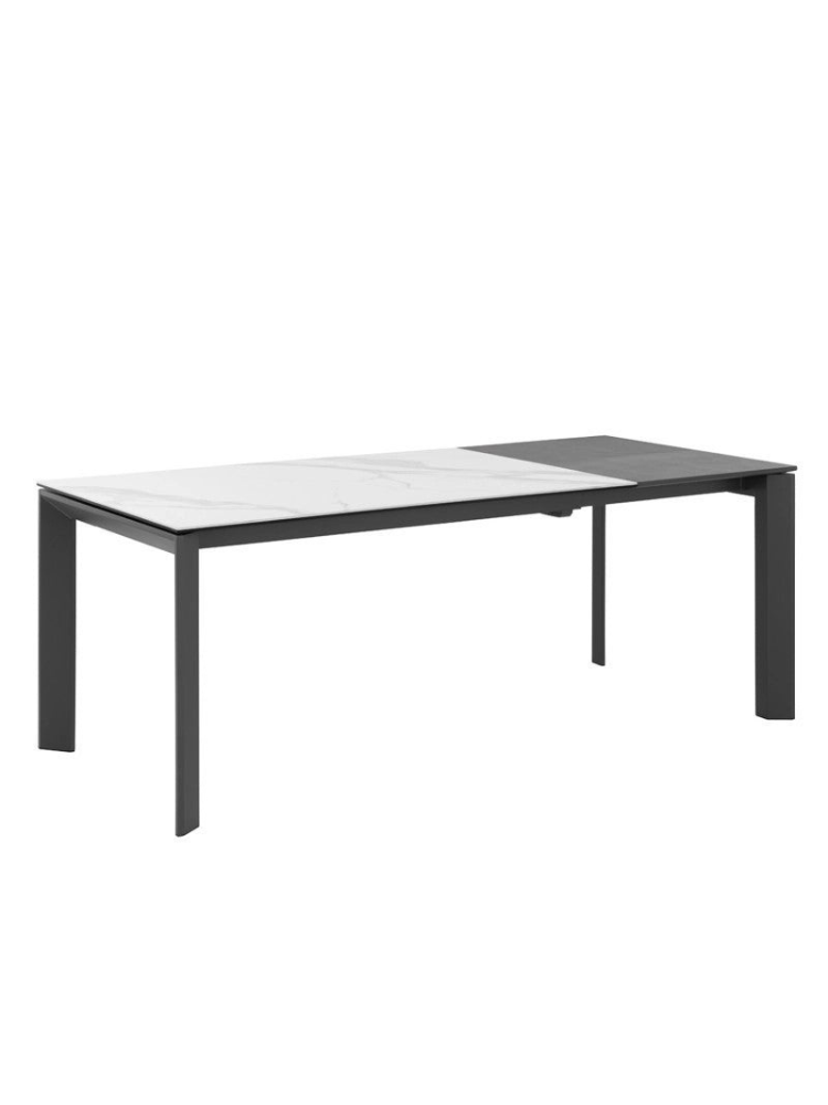 Mesa extensível apresenta um tampo em porcelana 5mm + vidro temperado 8mm) e a extensão em lacado.