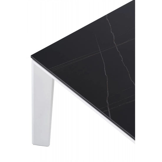 Mesa extensível apresenta um tampo em 2 diferentes acabamentos (porcelana 5mm + vidro temperado 8mm) e a extensão em lacado branco.