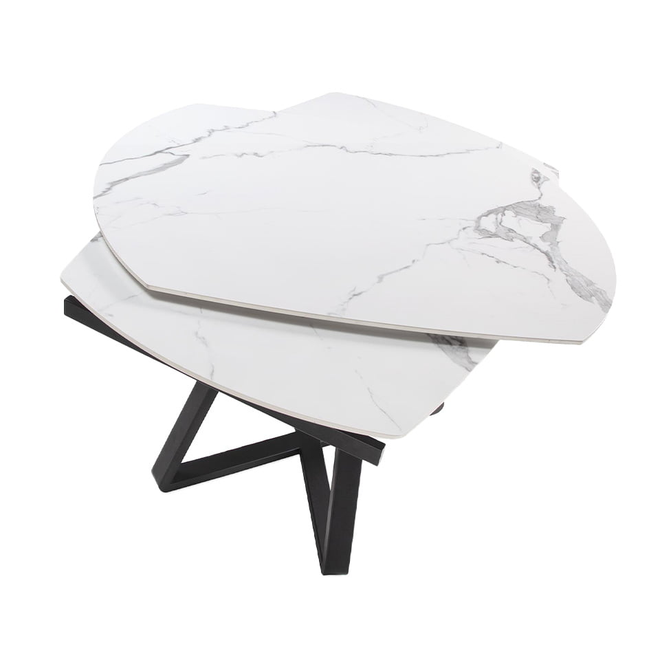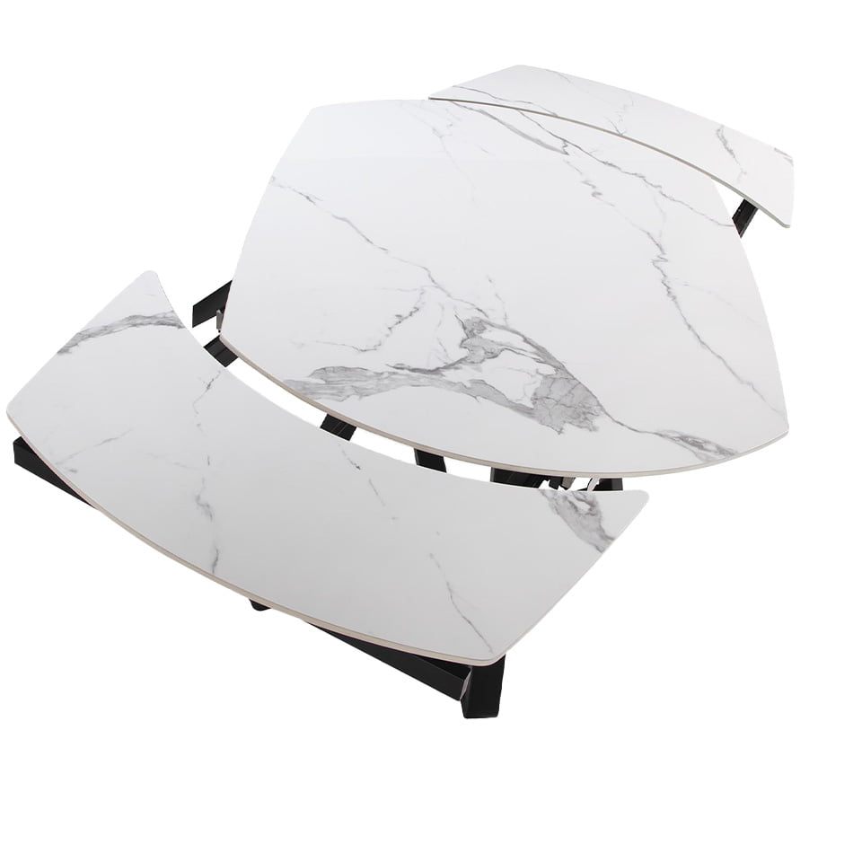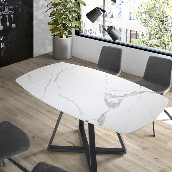 Mesa de jantar oval extensível de design moderno com tampo em mármore de porcelana branca com veios cinzentos e acabamento brilhante.