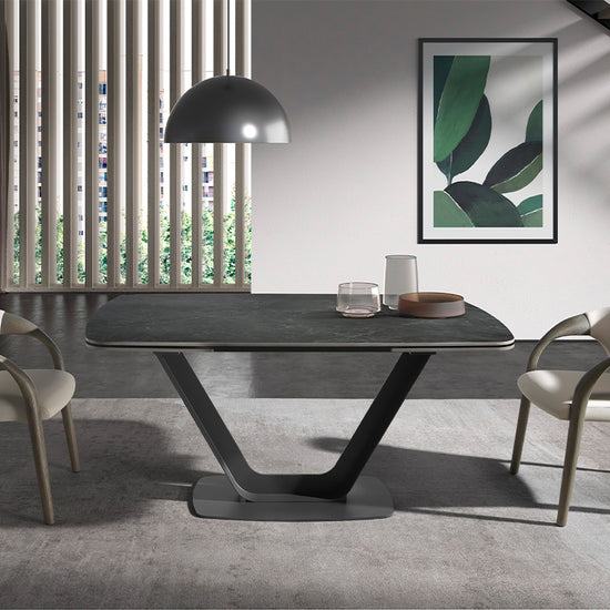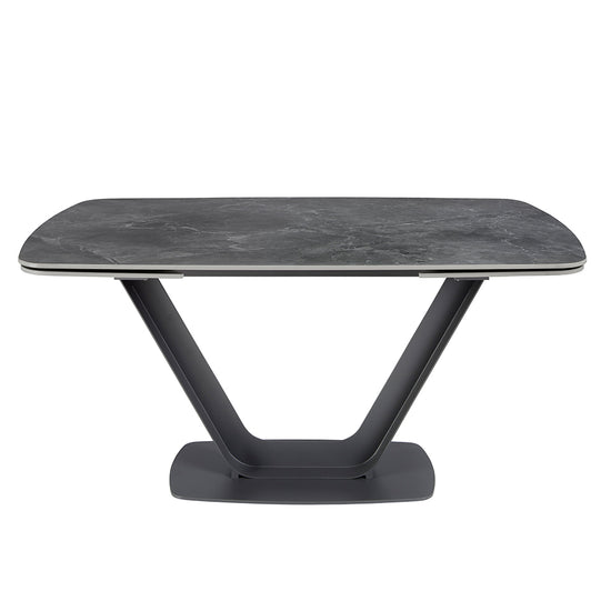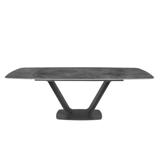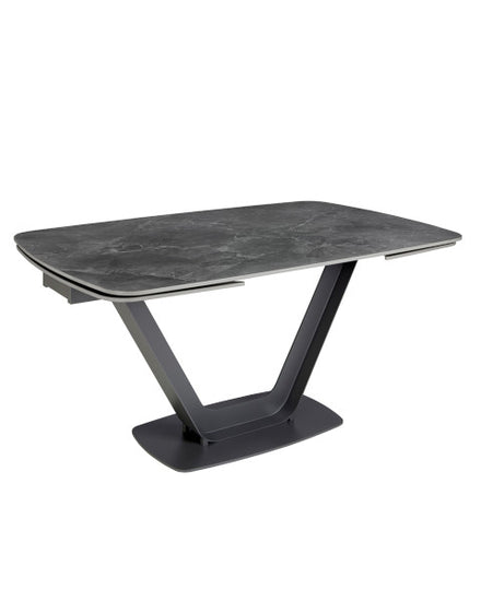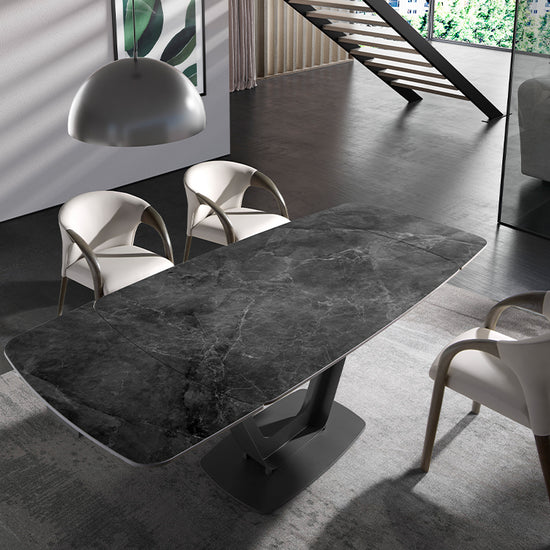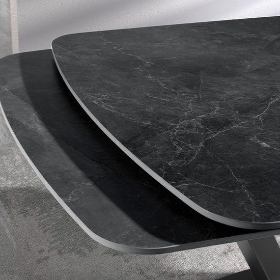 Mesa de jantar oval extensível de design moderno com tampo em mármore de porcelana preta com veios cinzentos em acabamento mate.