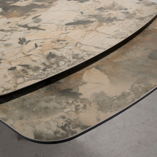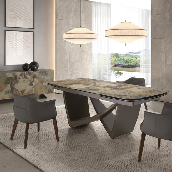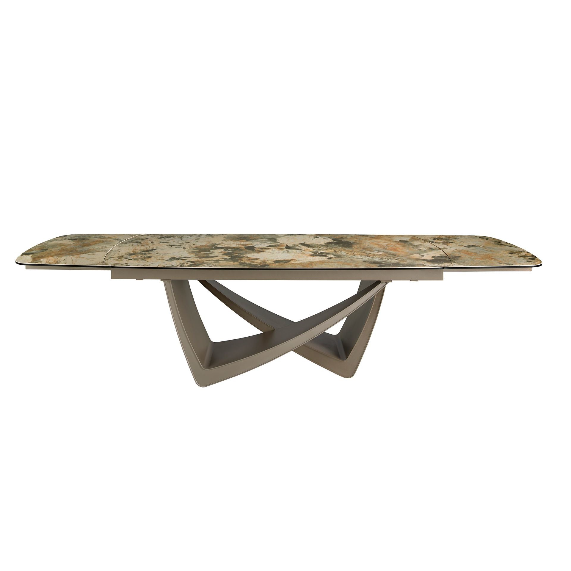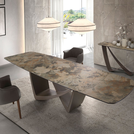 Mesa de jantar oval extensível de design moderno com tampo em mármore porcelânico em tons terra e cinza com acabamento mate.