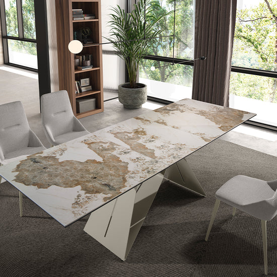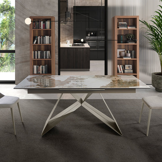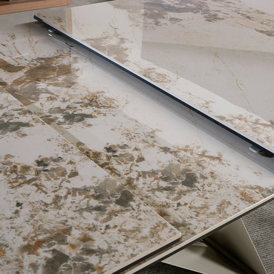 Mesa de jantar extensível retangular de design moderno com tampo em mármore porcelanato branco com veios em tons de terra e acabamento brilhante. As suas pernas em aço inoxidável na cor champanhe e a sua adaptabilidade fazem dele um móvel totalmente funcional e versátil para o uso diário.