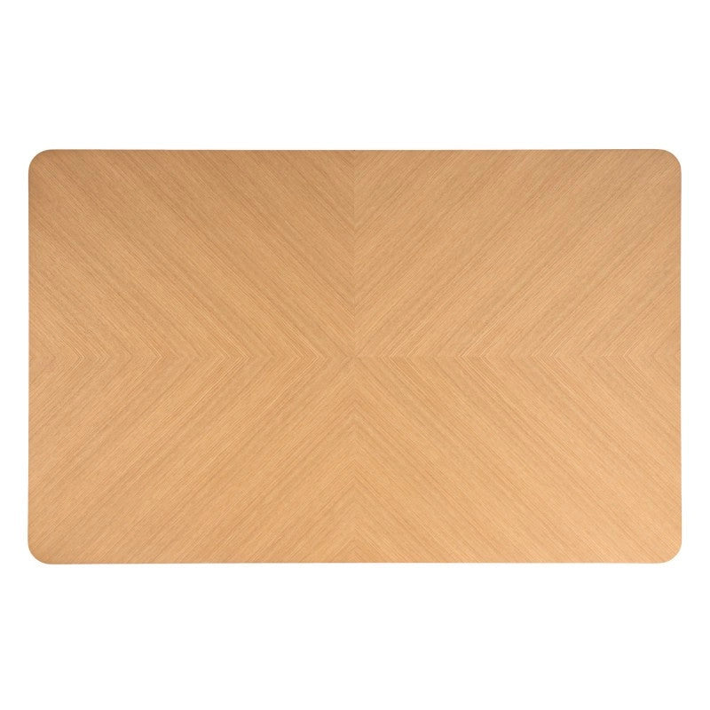 Mesa de madeira retangular de 180x95cm com estrutura e pés em madeira de hevea e tampo fixo com acabamento em carvalho ou nogueira de 30mm de espessura.