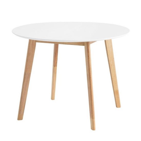 Mesa de madeira redonda com 100cm de diâmetro. Pernas em madeira de faia e tampo fixo lacado a branco com 18mm de espessura.