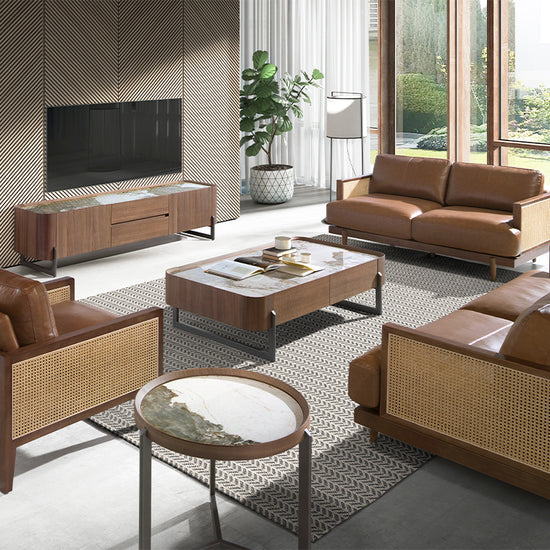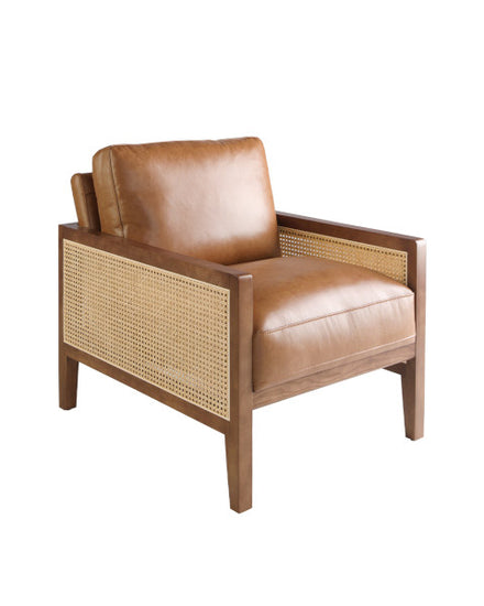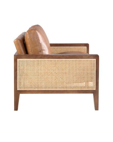 Poltrona de design moderno com braços e assento e encosto estofados em pele de bovino. Tanto pelos detalhes em rattan como pelas pernas em madeira cor de nogueira, esta poltrona é a combinação perfeita entre design e conforto.