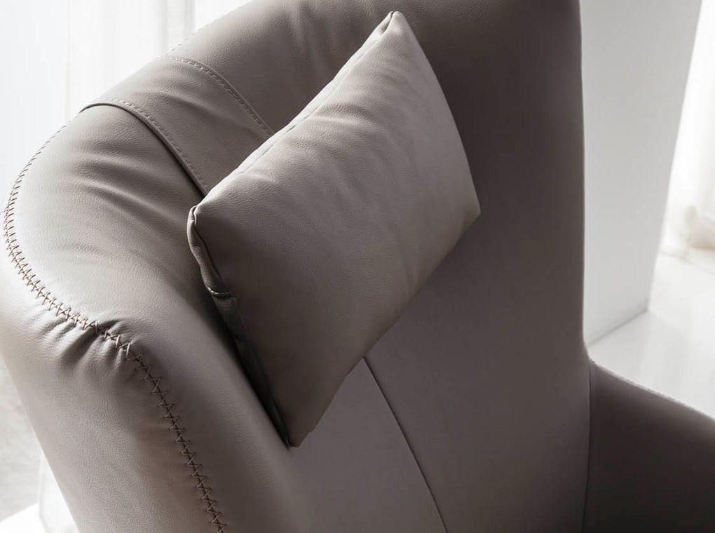 Poltrona giratória com braços de design moderno com assento e encosto estofados em imitação de pele. Tanto pelo seu estilo como pelas pernas em aço inoxidável escurecido, esta poltrona é a combinação perfeita entre design e conforto.