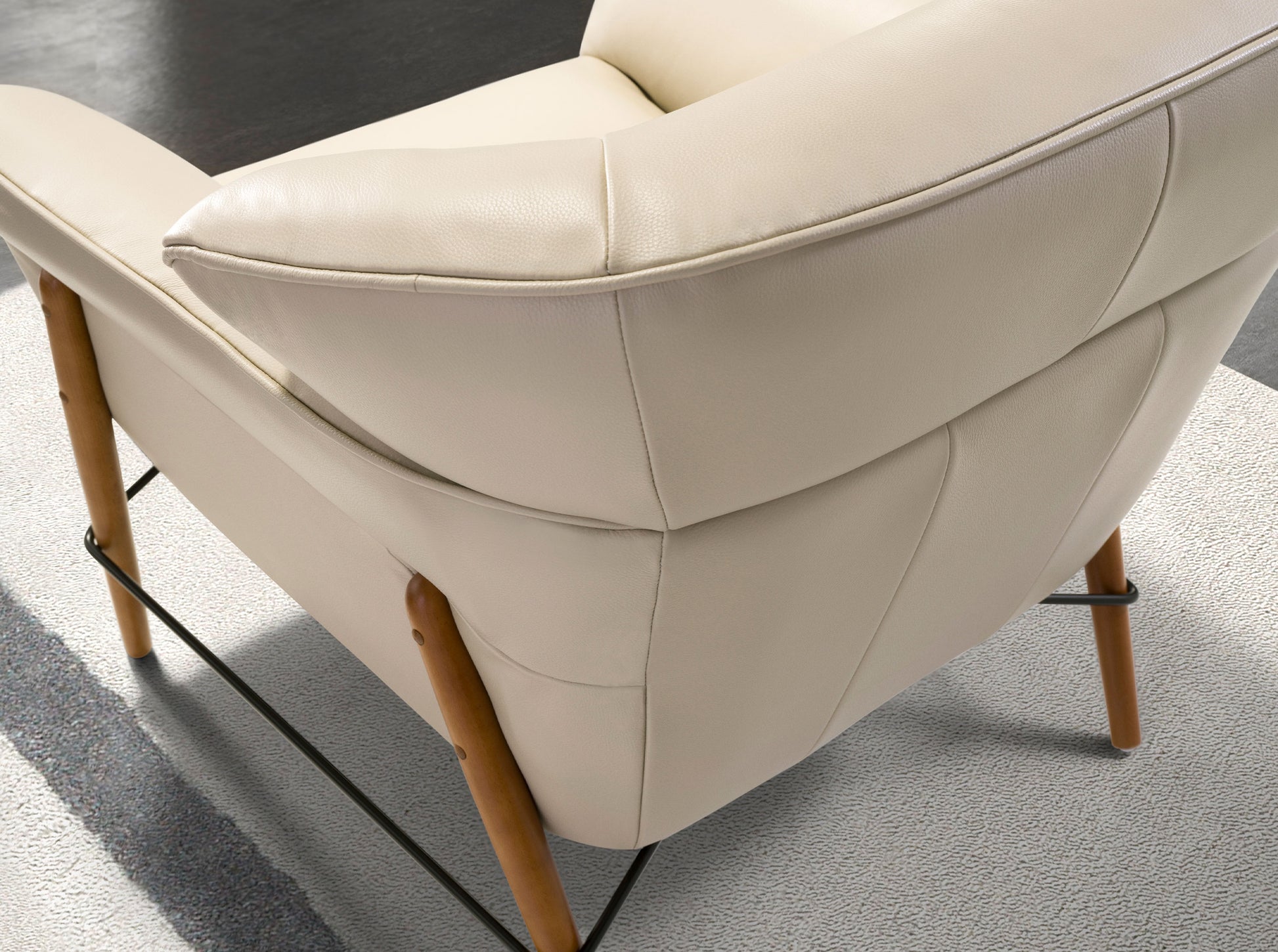 Poltrona de design moderno com braços e assento e encosto estofados em pele de bovino cor de areia. Tanto pelos detalhes em aço inoxidável preto como pelas pernas em madeira cor de mel, esta poltrona é a combinação perfeita entre design e conforto.
