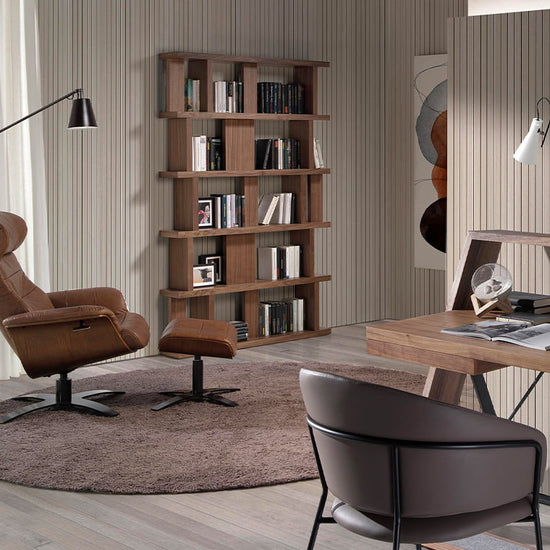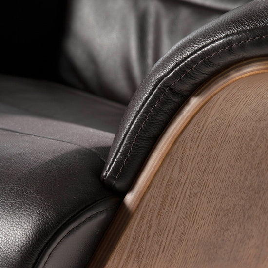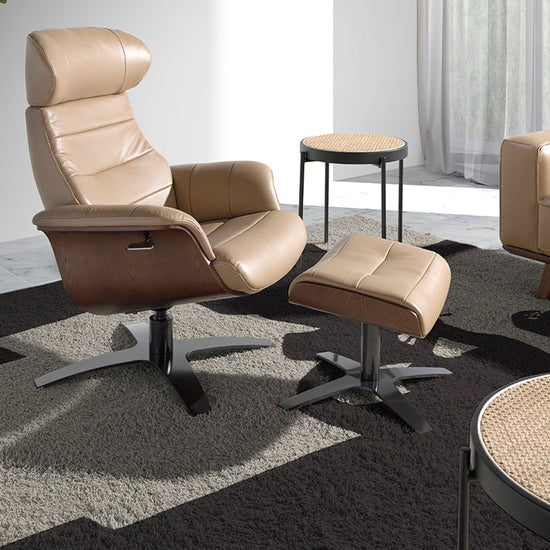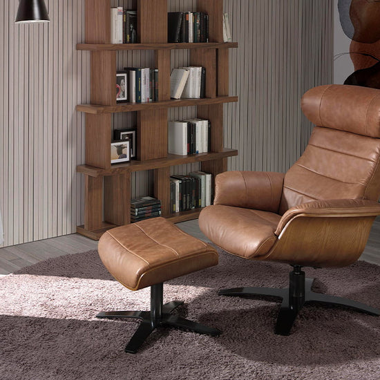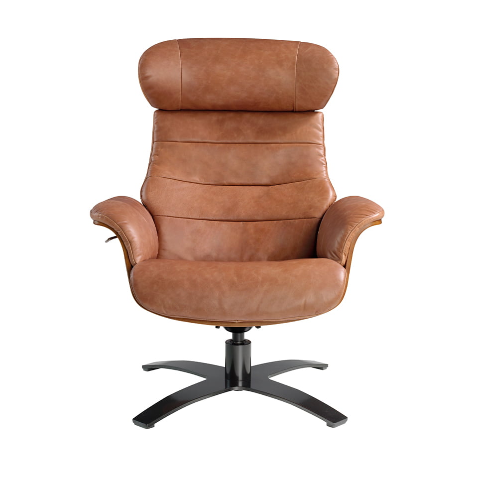 Poltrona giratória reclinável com braços de design moderno com assento e encosto estofados em pele natural. Tanto pelos detalhes em madeira folheada a nogueira natural como pelas pernas em aço inoxidável polido escurecido, esta poltrona é a combinação perfeita entre design e conforto.