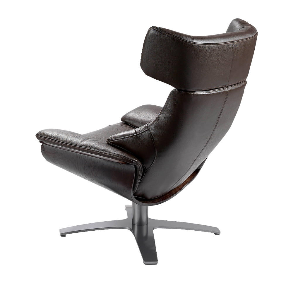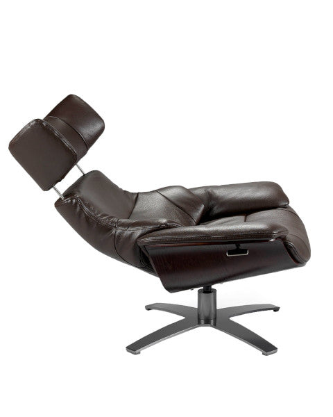 Poltrona giratória reclinável com braços de design moderno com assento e encosto estofados em pele natural. Tanto pelo seu estilo como pelas pernas em aço inoxidável, esta poltrona é a combinação perfeita entre design e conforto.