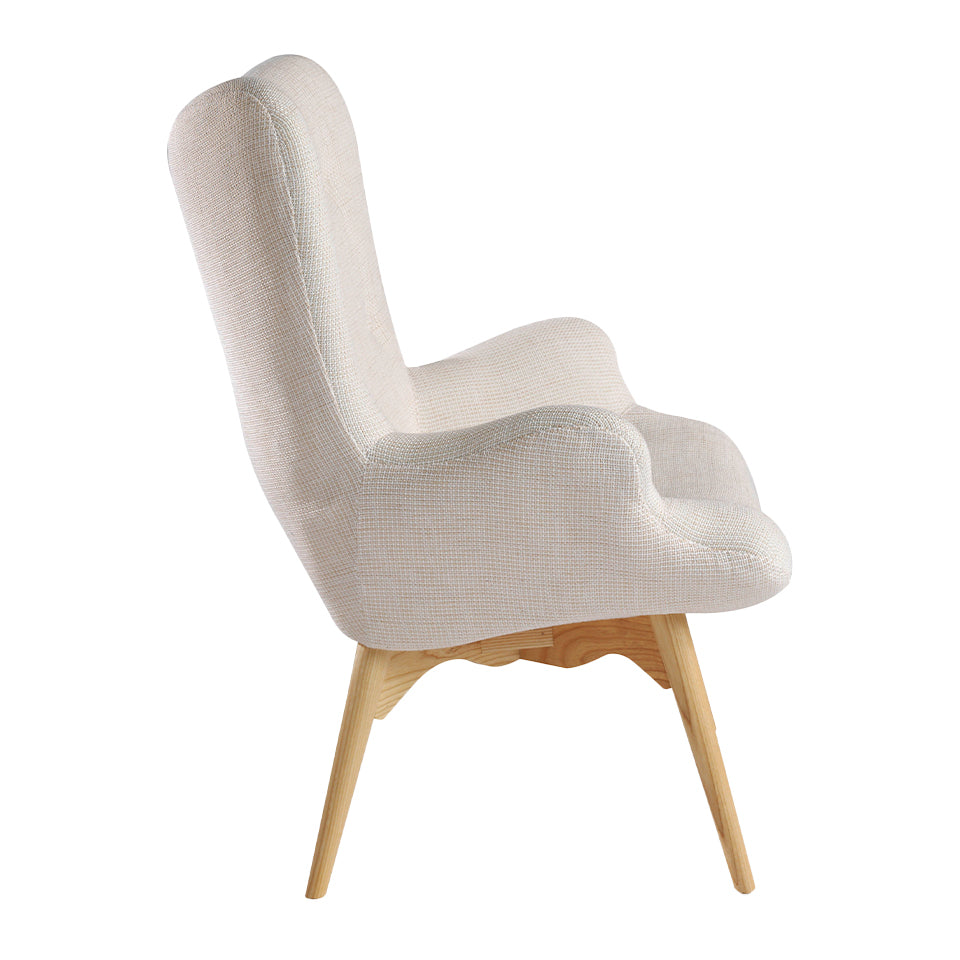 Poltrona de design moderno com braços com assento e encosto estofados em tecido bege.