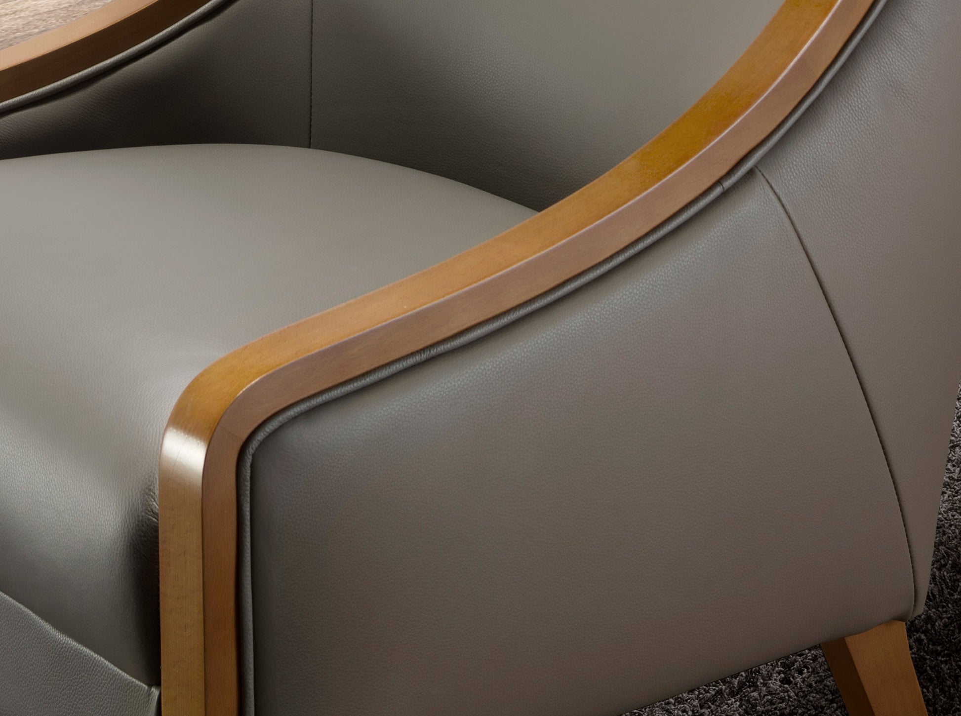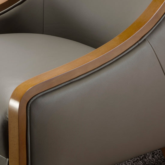 Poltrona de design moderno com braços e assento e encosto estofados em pele de bovino cinzenta. Tanto pelo seu estilo como pelas pernas de madeira cor de mel, esta poltrona é a combinação perfeita entre design e conforto.