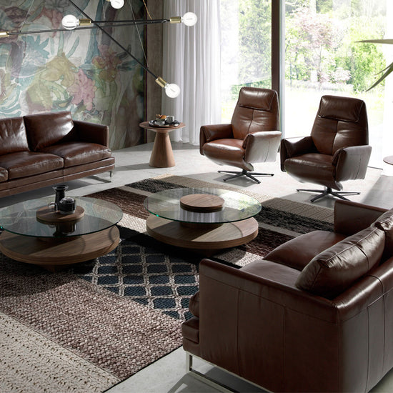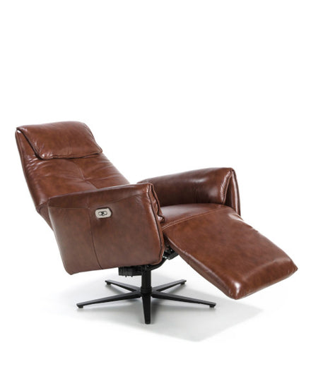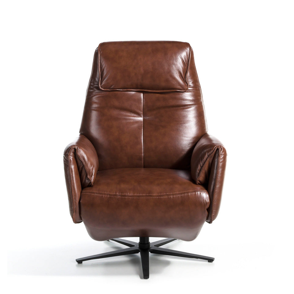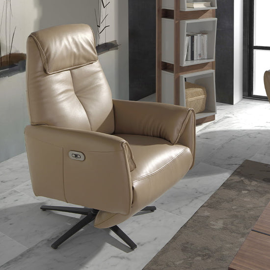 Poltrona giratória relaxante com braços de design moderno com assento e encosto estofados em pele natural. Tanto pelo seu estilo como pelas pernas em aço inoxidável escurecido, esta poltrona com mecanismo eléctrico de relaxamento é ideal para proporcionar o equilíbrio perfeito entre estilo e conforto.