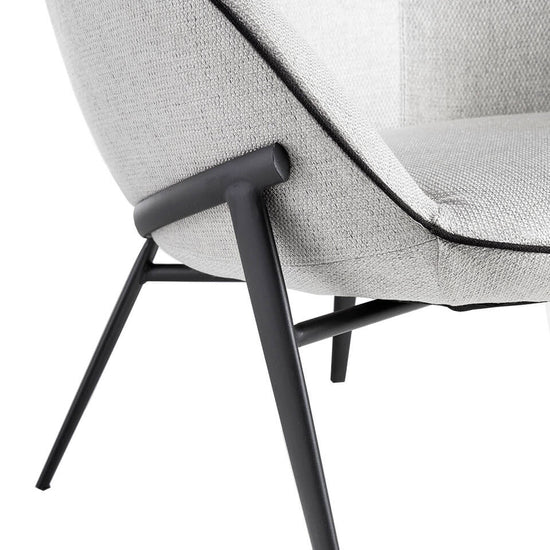 Poltrona com braços de design moderno com assento e encosto estofados em tecido cinza. Tanto pelo seu estilo como pelas pernas em aço inoxidável preto, esta poltrona é a combinação perfeita entre design e conforto.