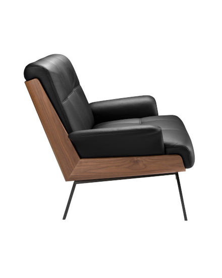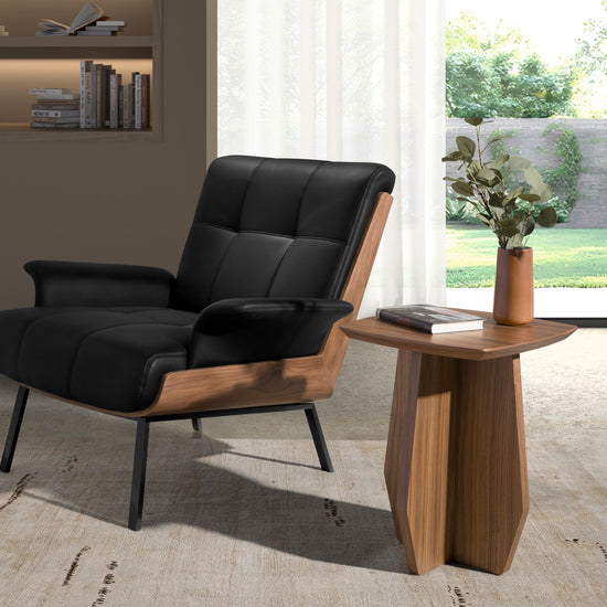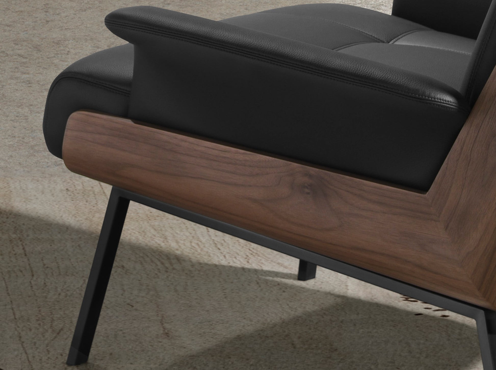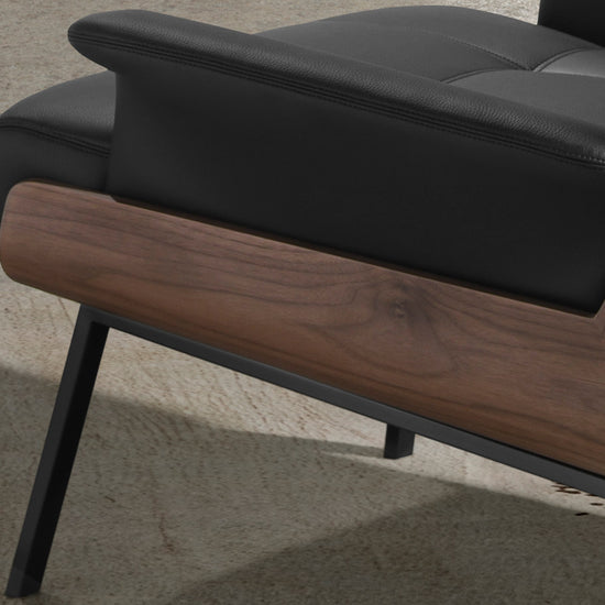 Poltrona de design moderno com braços e assento e encosto estofados em pele sintética preta. Tanto pelos detalhes em madeira folheada a nogueira natural como pelas pernas em aço inoxidável preto, esta poltrona é a combinação perfeita entre design e conforto.